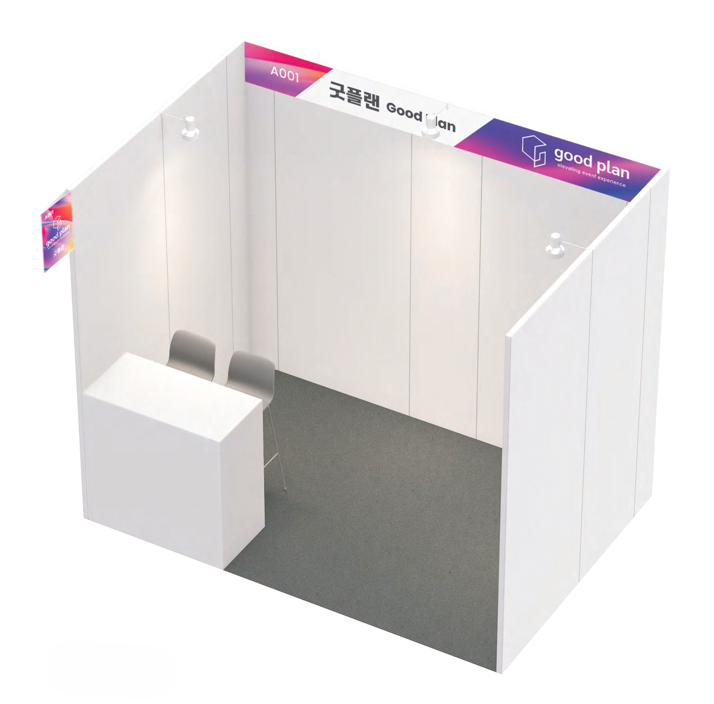 | 부스 면적만 제공 (1부스 기준 가로3m * 세로3m) | 부스 면적 제공 (1부스 기준 가로3m * 세로3m) + 벽체, 상호간판, 불연카페트, 전기배선공사, 콘센트 1개(220v, 2구), 조명 5개(부스당), 인포데스크 및 의자 1세트(기업당) | 부스 면적 제공 (1부스 기준 가로3m * 세로3m) + 벽체, 상호간판, 불연카페트, 전기배선공사, 콘센트 1개(220v, 2구), 조명 3개(부스당), 인포데스크 및 의자 1세트(기업당) |